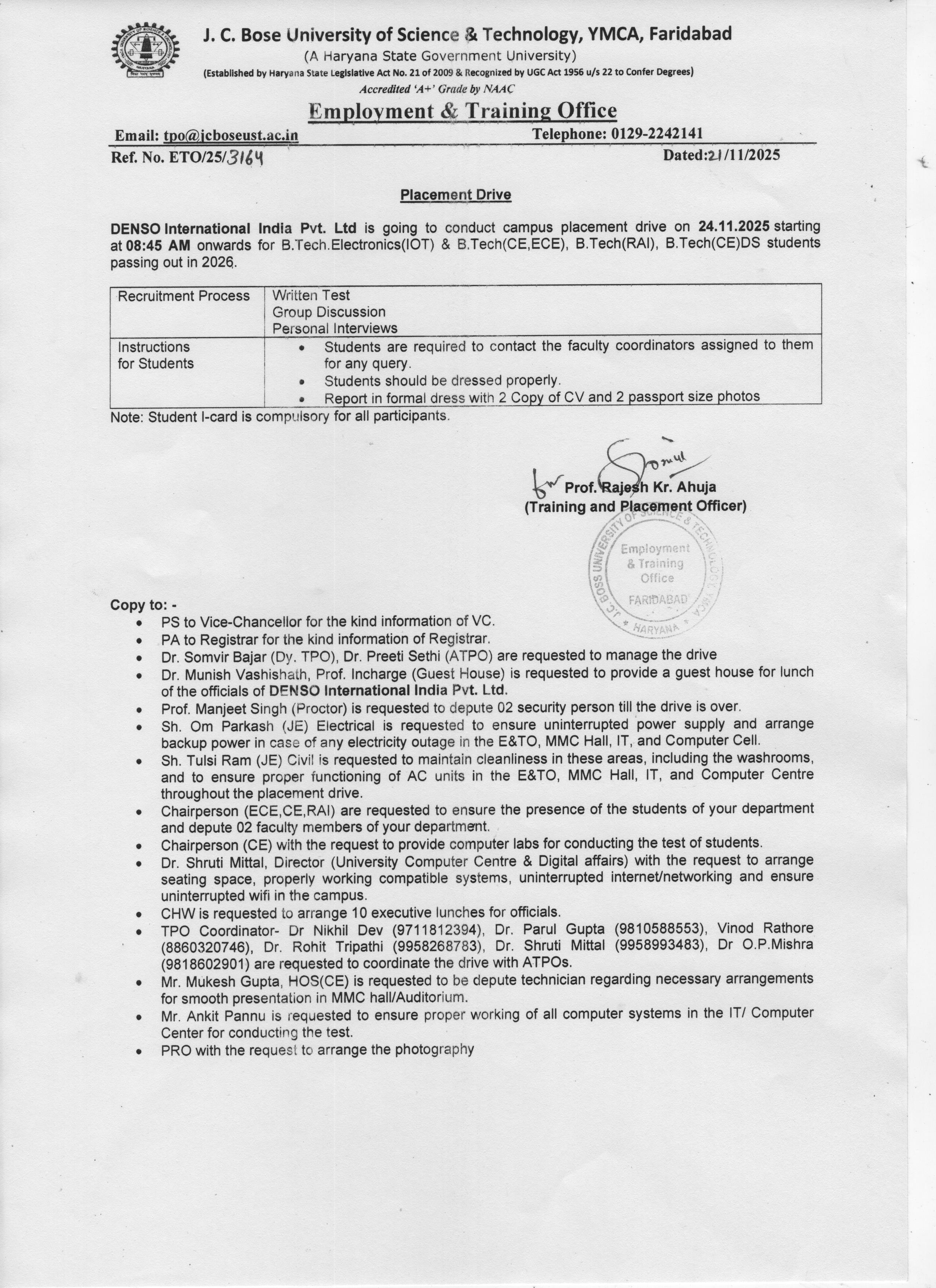 DENSO International India Pvt. Ltd. Campus Placement Drive Notice