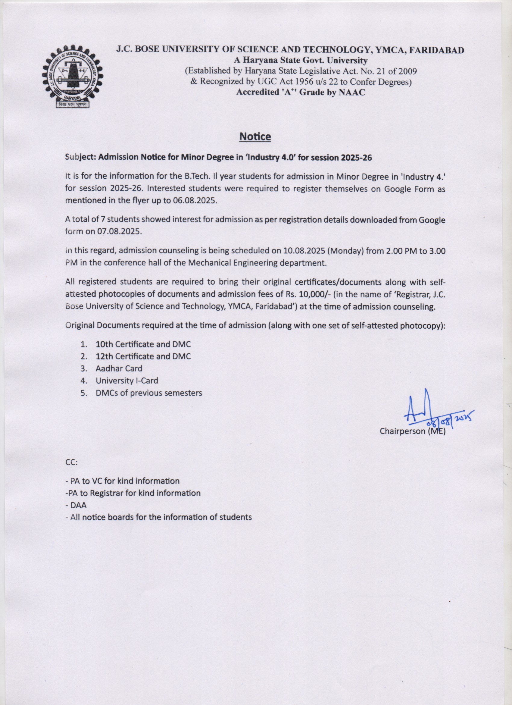 Selection Process (Interview) for Vishwa Prakash Mission Scholarship of B.Tech-1st year students admitted in the session 2025-26