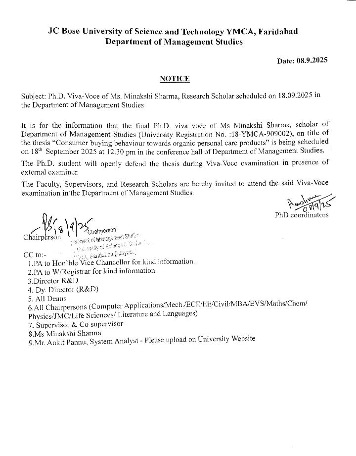 Final PhD viva voce of Ms. Manisha(University Registration No: 17-YMCA-909002),, scholar of Department of Management Studies on 24.12.2025