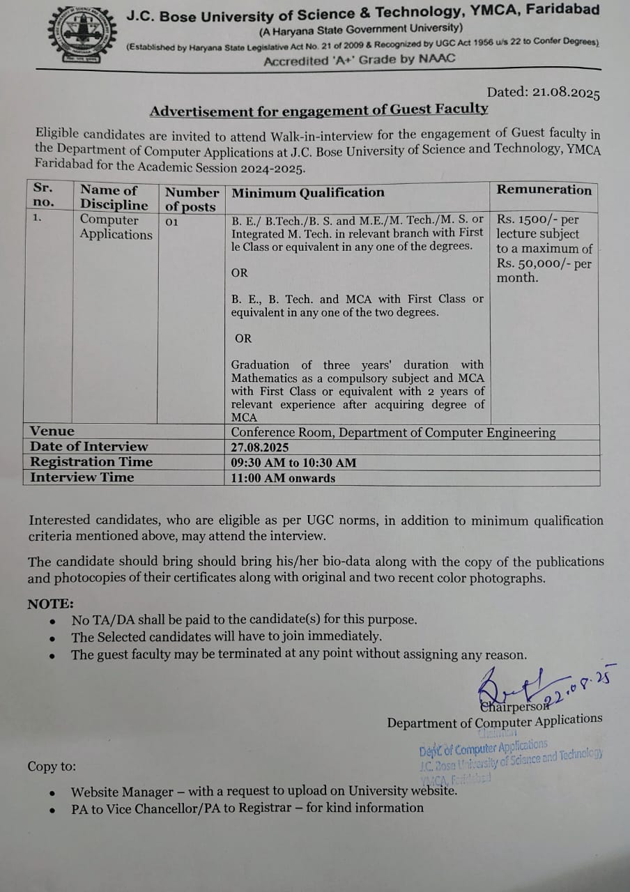 Advt. No. 02/2025 : Walk-in-Interview for engagement of various supporting staff at J.C.Bose UST, YMCA, Faridabad