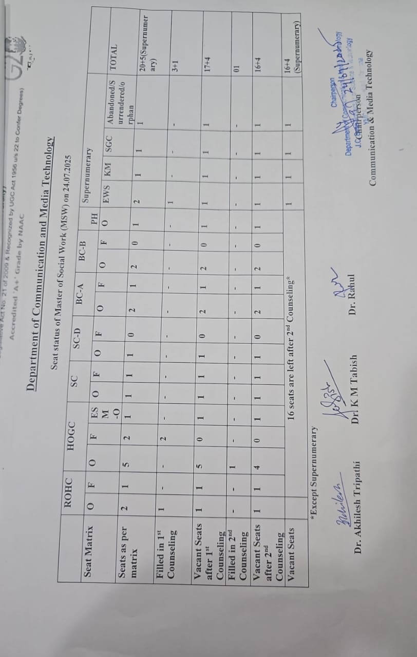 Merit List for MSW - 1st Counseling (Admission 2025-26)