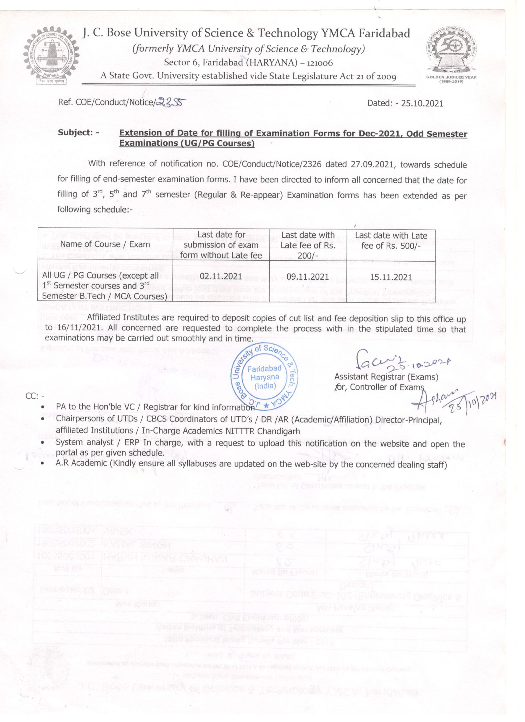 Extension of Date for filling of Examination Forms for Dec- 2021, Odd Semester Examinations (UG/PG Courses)