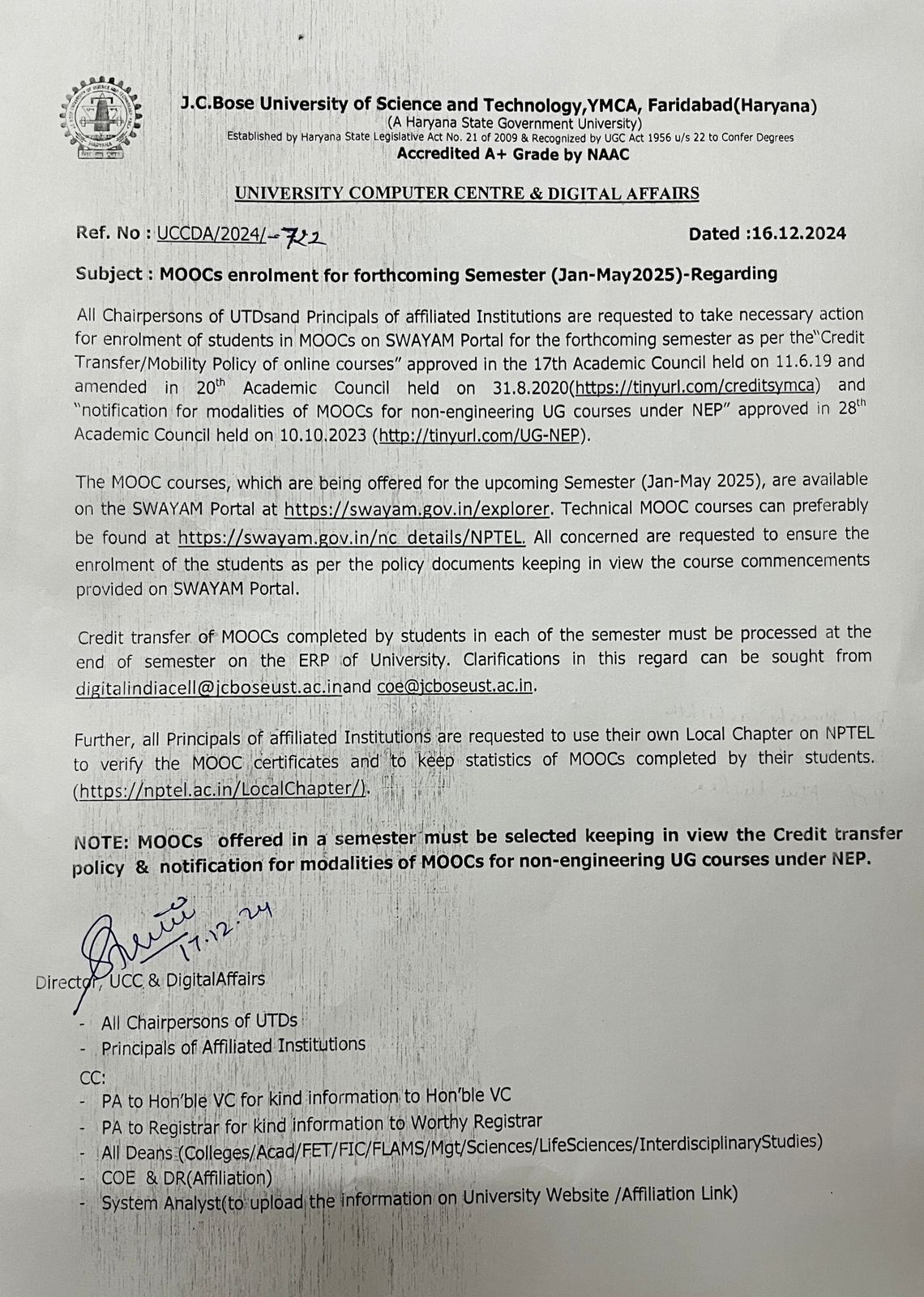 MOOC enrollment notice for upcoming semester Jan to June 2025