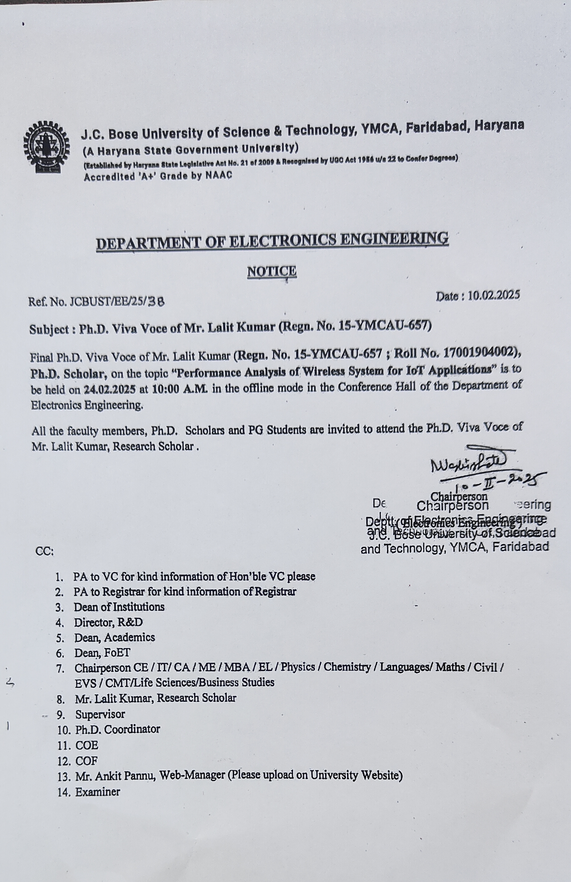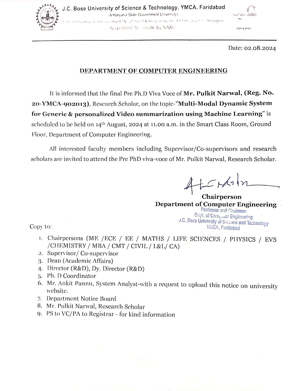Ph.D. Viva-Voce of Mr. Sunil Kumar, Research Scholar scheduled on 26.12.2025 at 10.30 AM in the Department of Computer Science & Engineering