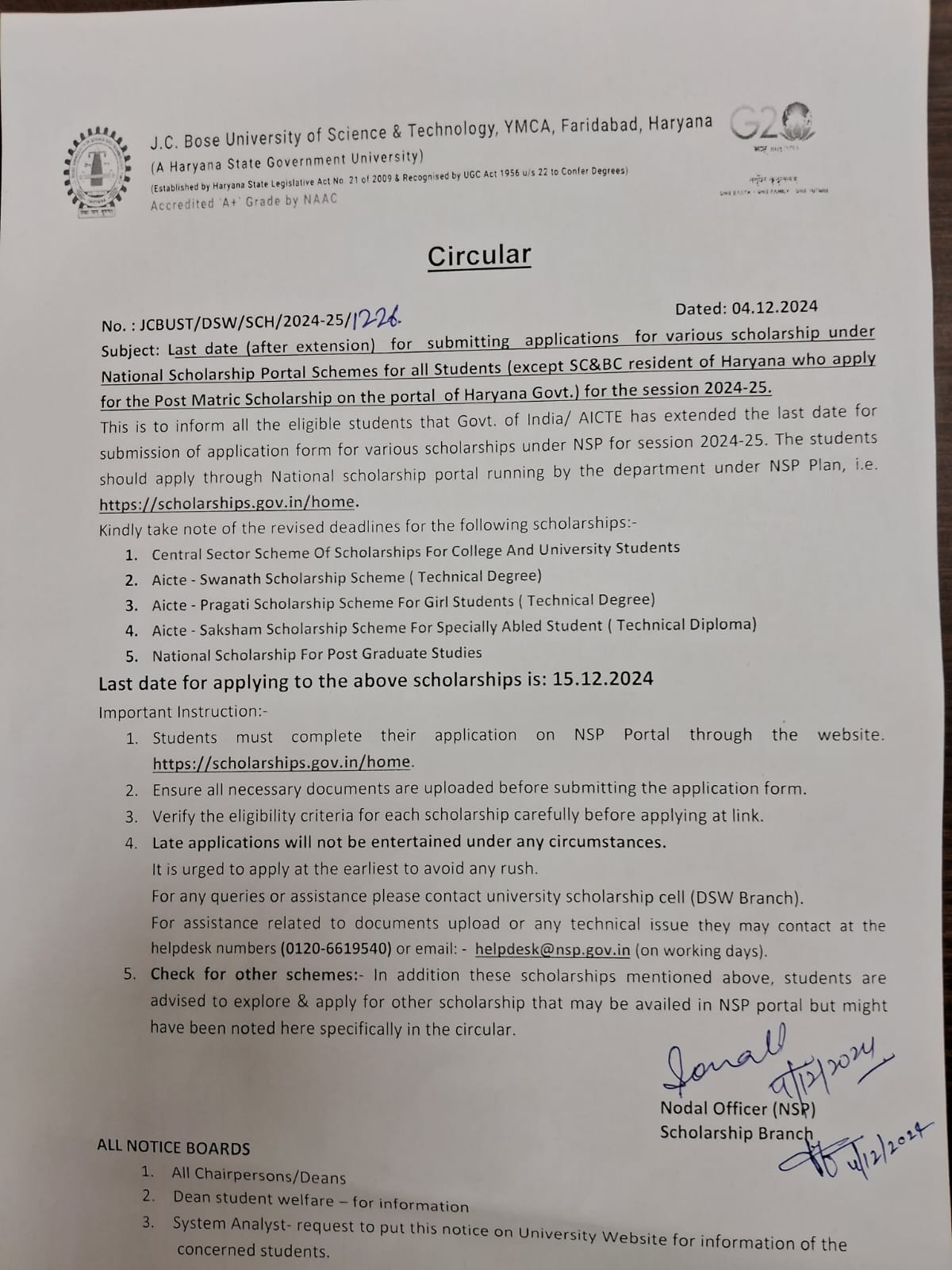 Last date (after extension) for submitting applications for various scholarship under National Scholarship Portal Schemes for all Students for the session 2025-26.