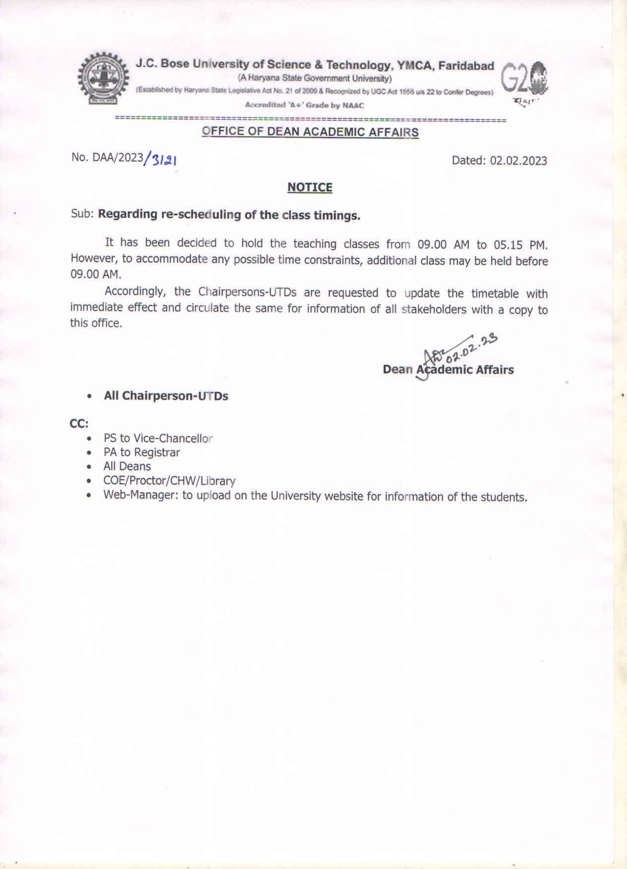 Date sheet for Supplementary Examination, Jan-2026