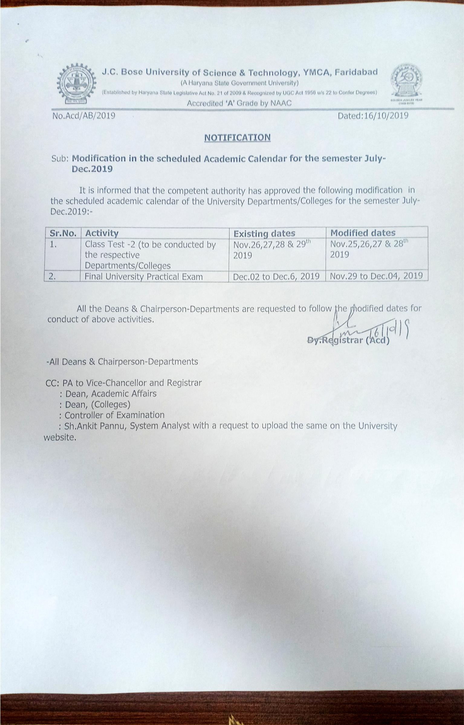 Revised Final Theory Examination Schedule for Bridge Course - 2019 Students (1st sem)