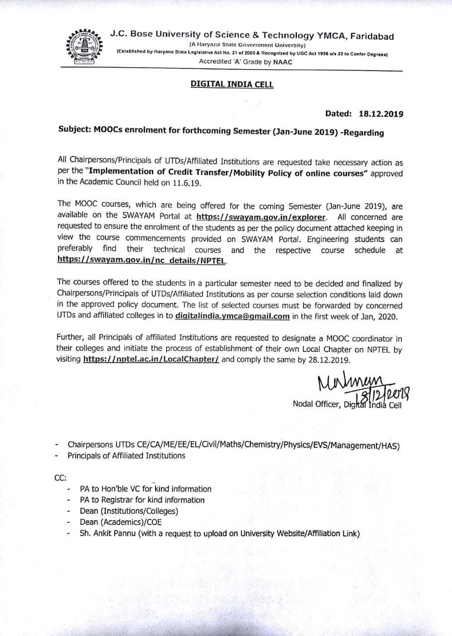 Final Theory Examination Schedule for Bridge Course - 2019 (1st sem)
