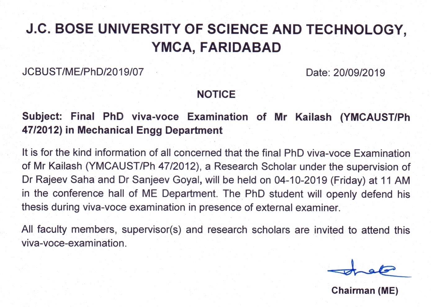 Final Phd Viva-voce of Mr. Sumit Singh (20001910005), scheduled on 13.01.2026 at 11AM in the department of Mechanical Engineering