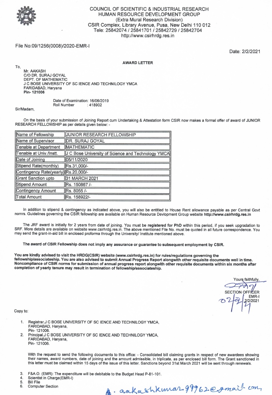 | 4 | Krishan(MATHS) | Nov-20 | 2 Years | JRF | CSIR | NET/JRF | View |