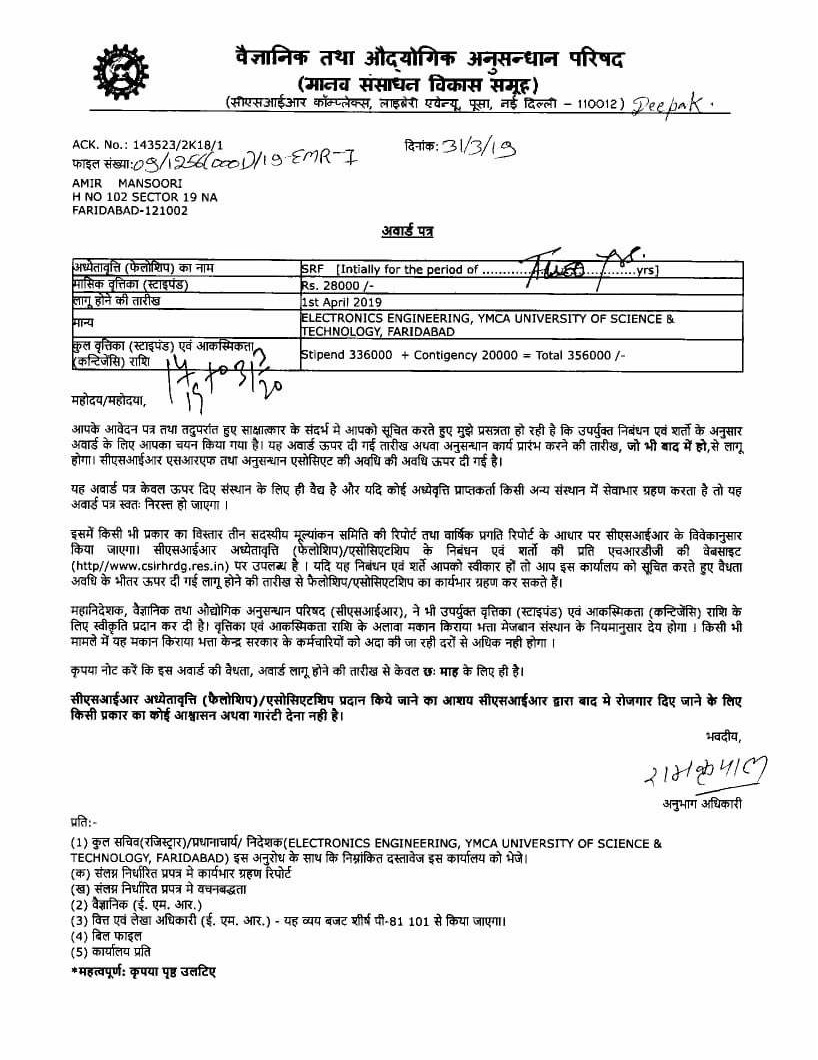 | 3 | Amir Mansoori (ECE) | Jul-17 | 2 year | SRF | CSIR | GATE | View |