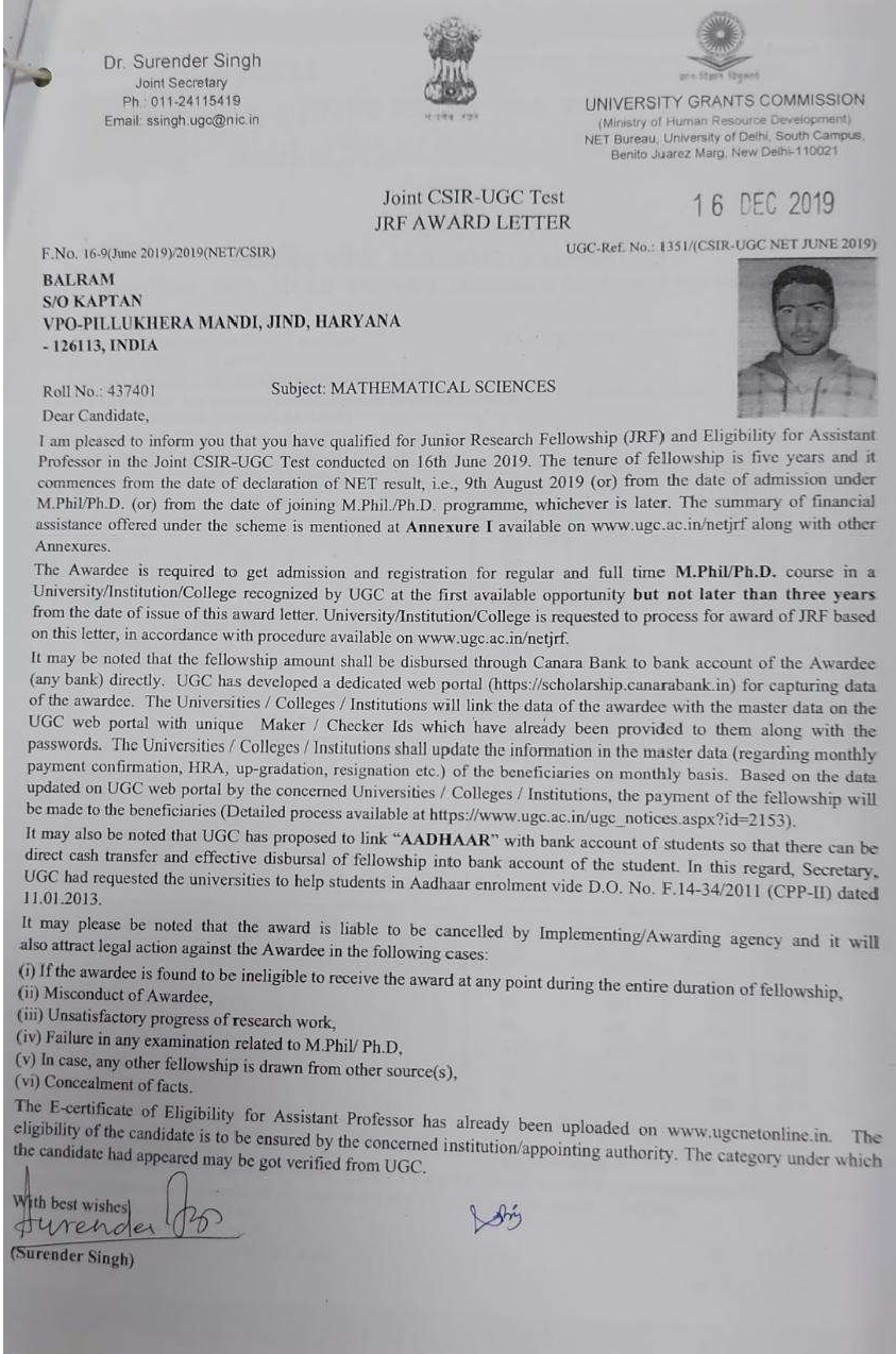 | 1 | Balram(MATHS) | Nov-20 | 5 years | JRF | CSIR | NET/JRF | View |