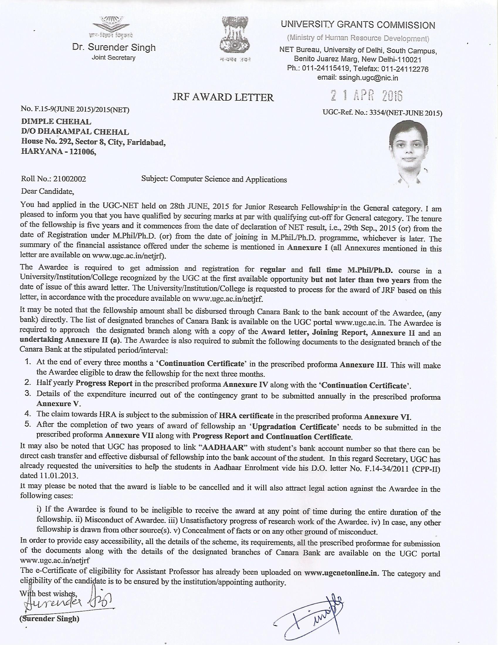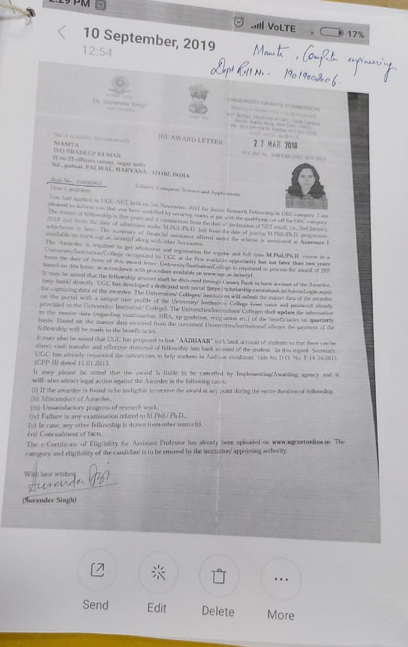 | 1 | Dimple (CE, IT) | Jul-17 | 5 years | JRF | UGC | NET | View |