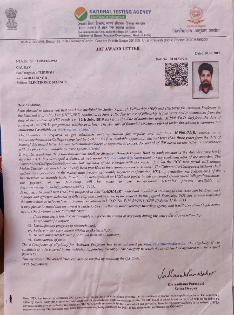 | 7 | Gaurav (EL) | Jul-19 | 5years | JRF | UGC | GATE | View |