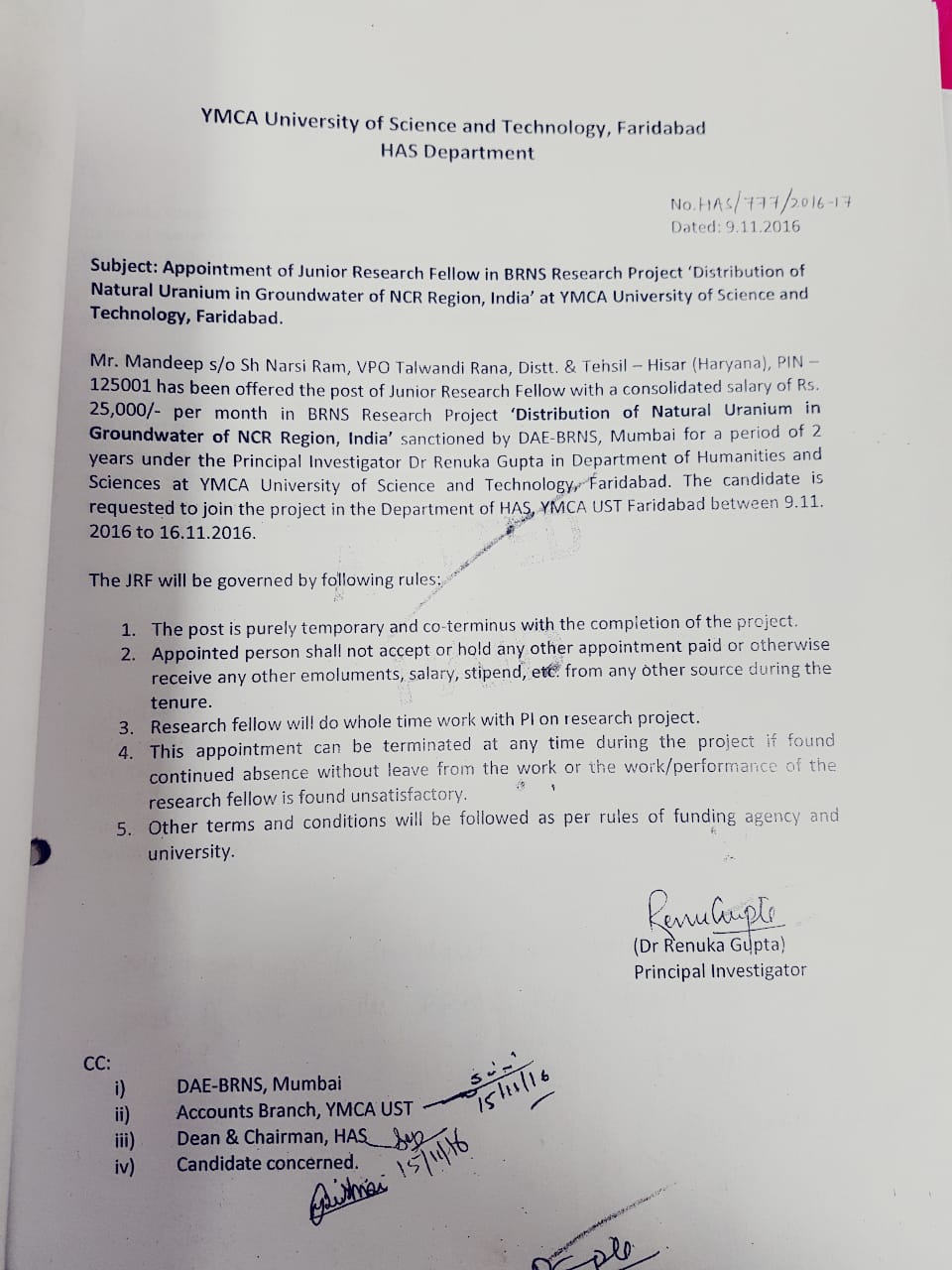 | 1 | Mandeep (Environmental Sciences) | Nov-16 | 3 years | JRF | BRNS project | NET | View |