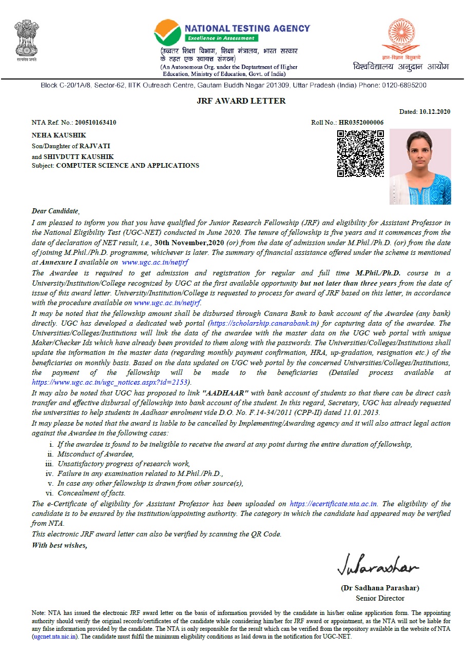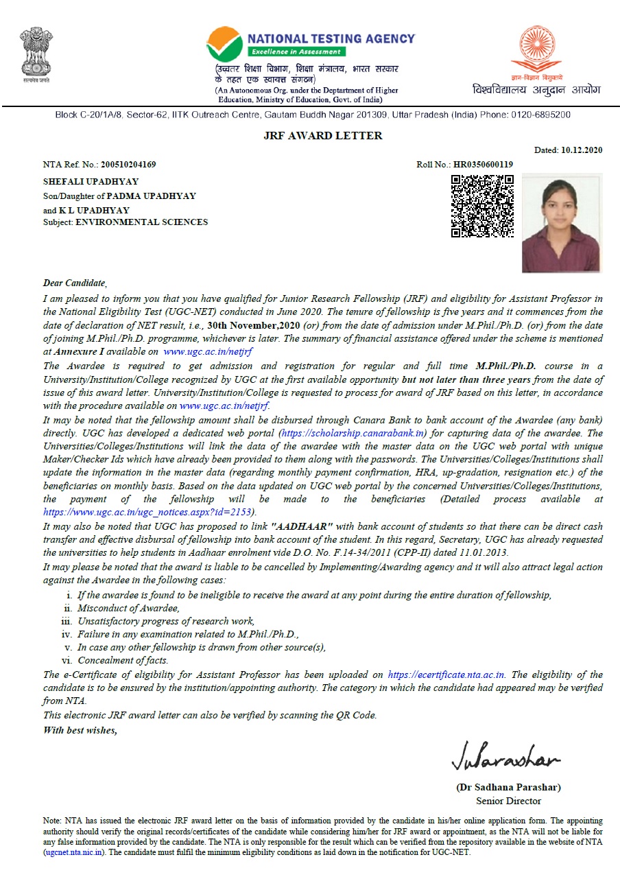 | 2 | Neha Kaushik | Nov-20 | 5 year | JRF | UGC | NET/JRF | View |