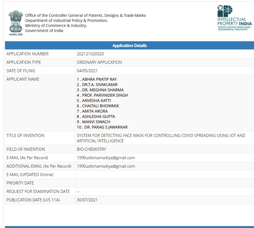 | 10 | Dr. Amita Dr. Manvi Dr. Ashlesha Gupta | 202121020320 | System for Detecting Face Mask for Controlling Covid spreading using IOT and Artificial Intelligence | 30.07.2021 | view/Download |