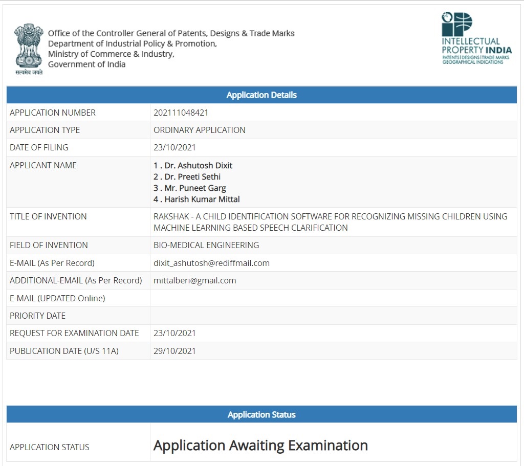 | 15 | Dr. Ashutosh Dixit, Dr. Preeti Sethi | 202111048421 | Rakshak - A Child identification software for recognizing missing children using Machine Learning based Speech Clarification | 29.10.2021 | view/Download |