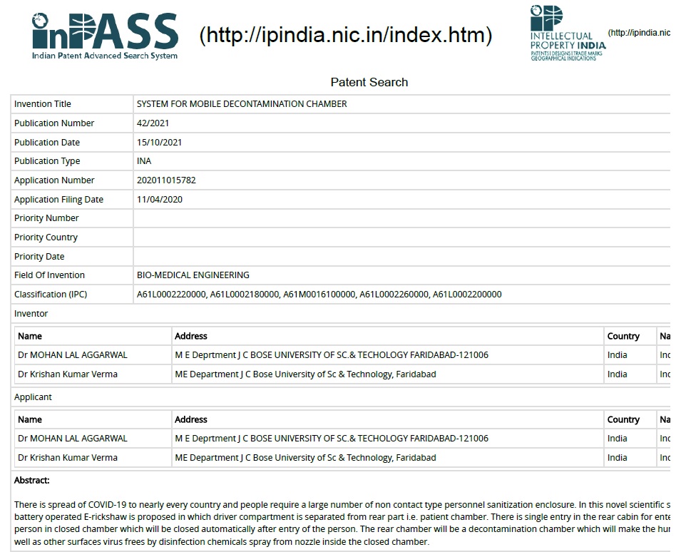 | 13 | Dr. Mohan Lal Aggarwal | 202011015782 A | System for Mobile Decontamination Chamber | 15.10.2021 | view/Download |